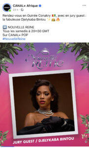 Djelykaba Bintou est la première chanteuse guinéenne à être dans cette émission. Elle est invitée avec plusieurs personnalités comm Jury Guest de l’émission , ‘’Nouvelle Reine’’.