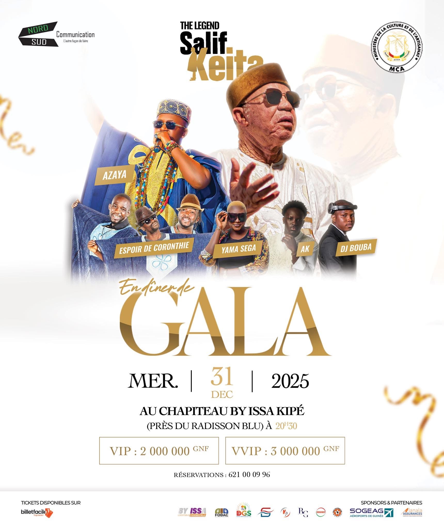 La structure Nord-Sud Communication a dévoilé les détails du Dîner de Gala musical du 31 décembre, qui se tiendra au Chapiteau By Issa de Kipé. La soirée promet d’être exceptionnelle avec la présence de la légende de la musique africaine Salif Keïta, accompagné de Azaya, Yama Sega, AK, et du groupe mythique Les Espoirs de Coronthie.