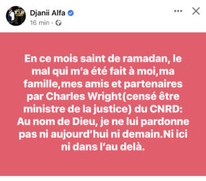 « En ce mois saint de ramadan, le mal qui m’a été fait à moi, ma famille, mes amis et partenaires par Charles Wright (censé être ministre de la Justice) du CNRD: au nom de Dieu, je ne lui pardonne pas ni aujourd’hui ni demain. Ni ici ni dans l’au-delà. » A posté Djanii Alfa.