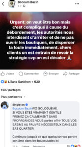 Les responsables des boutiques, Bocoum Bazin se sont exprimés sur la page officielle de l’entreprise en disant aux citoyens de quitter les lieux pour rentrer à la maison en attendant la nouvelle formule pour la distribution gratuite des bazins.